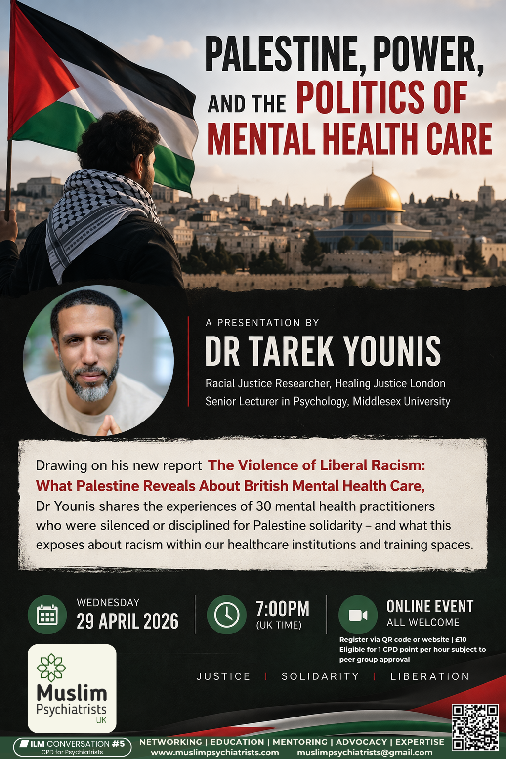A UK-based professional network of Muslim psychiatrists dedicated to promoting wellbeing, alleviating distress and advancing psychiatric practice in line with Islamic values and principles. Established in Ramadan 2023.